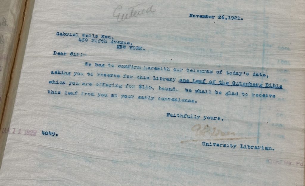 Our conversation with Visontay helped to pinpoint the finer details of the acquisition of McGill’s copy. About one hundred years ago, a two–volume set of an imperfect Gutenberg Bible (having parts mutilated or damaged and missing 53 leaves) was broken up by a noteworthy New York antiquarian bookseller named Gabriel Wells in 1921 and sold either as single leaves, or small sections representing key moments in the Bible.