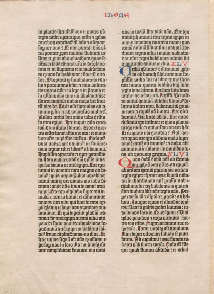 Several features of the Gutenberg Bible set it apart as an exquisite exemplar of print culture. The type is a bold and stately Gothic letter modeled on the “Textura” hand script. The ink is thick and deeply black, which makes the characters stand out on the high-quality white paper imported from Italy. The page layout is in double columns, perfectly justified to an even margin, with 42-lines of type to the page.It contains portions of the text of Jeremiah, based on the Latin Vulgate version of the Old Testament.