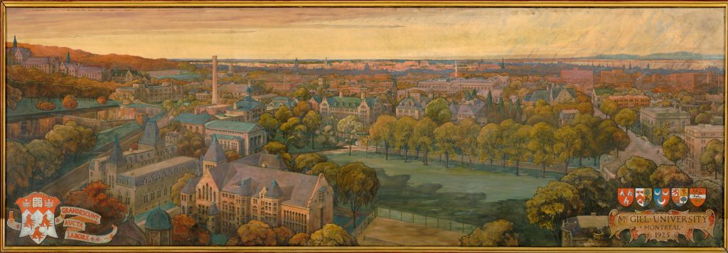 La détaillée Bird’s-Eye View of McGill University de Nobbs a été réalisée en 1925 et par la suite mise en aquarelle à grande échelle. En 2019, le Laboratoire de numérisation de la bibliothèque McGill a numerisé l’aquarelle originale et l’a même transformée en casse-tête de 1000 pièces!