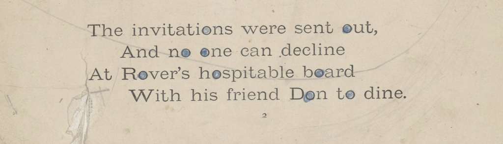 The McGill copy of this book has been very well loved by many wee readers over the years. Little hands have pencilled in many ds and os and scribbled in the margins. Many fingers have turned the pages–so many that this copy has lost pages and covers! While our copy is incomplete, intact copies exist at the library of Scotland and Cambridge University. They very kindly made copies and remote viewing available so that we could compare our dog-eared (pun intended) copy with an intact story. So, while we can appreciate the fine festive spirits of these doggy diners, we are missing some of the text, the cover – which identifies H.W. Petherick as the illustrator, as well as the central two-page spread that shows the entire dinner party at table. That toothsome spread shows well-clad canines about to drink a toast as a “footmen grand in plush” pace by with a dessert course. Fruit, fans, fine silks and frills clothe these society dogs as they each hold a glass of a light red wine – possibly sherry or madeira– to accompany the fruit course. I include a transcription of the full story below.