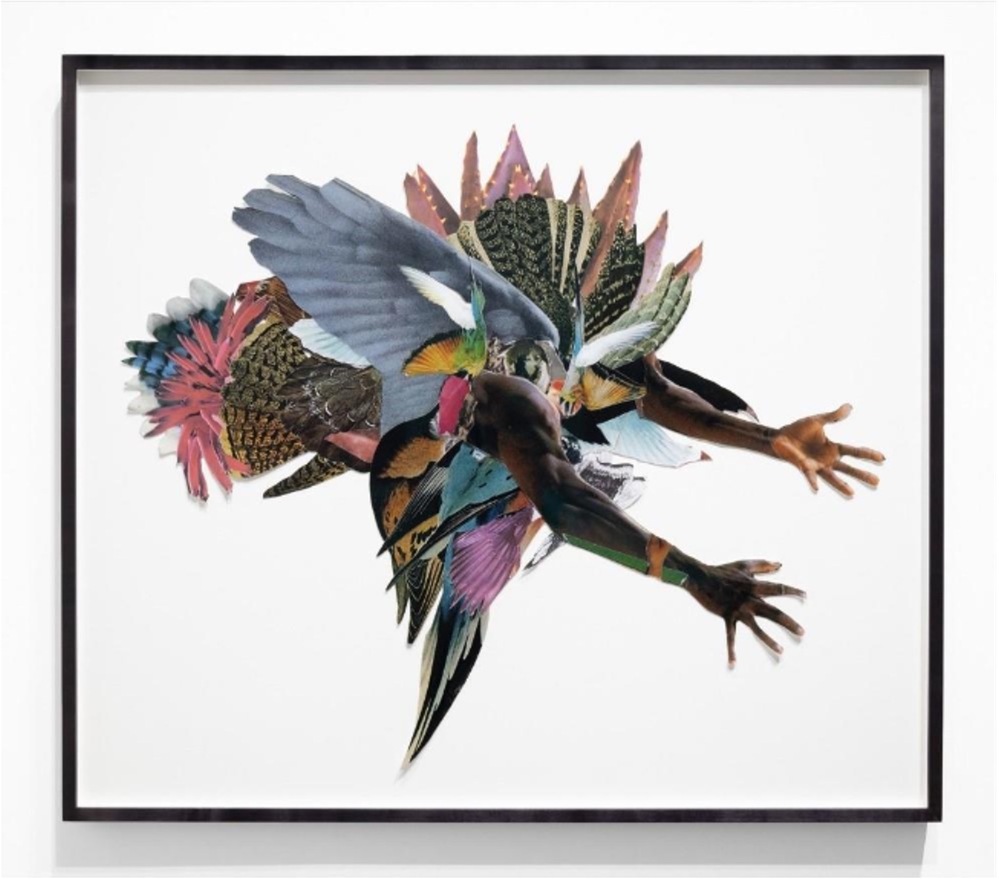 This logic is reinforced by Jones’s chosen medium: collage. His process is a Promethean act in itself, demanding foresight, selection, and synthesis, as disparate elements are consciously assembled toward a complete form already envisioned by the artist. In generating a collage, Jones effectively embodies Prometheus, labouring toward an outcome only he can fully perceive, giving creation as a gift while remaining acutely aware of its end. His process, something which he has described as an “organized, unorganized creation,” echoes both the mythic structure of forethought and his broader project of world-building.[2] Abstraction, found imagery, and resonant shapes and colours gesture beyond Western visual regimes and toward a more personal, reflective sense of being seen in the world.[3] Jones’s invocation of Prometheus situates his work within a long intellectual history that synonymizes Prometheus with Black struggles, particularly in the nineteenth century.